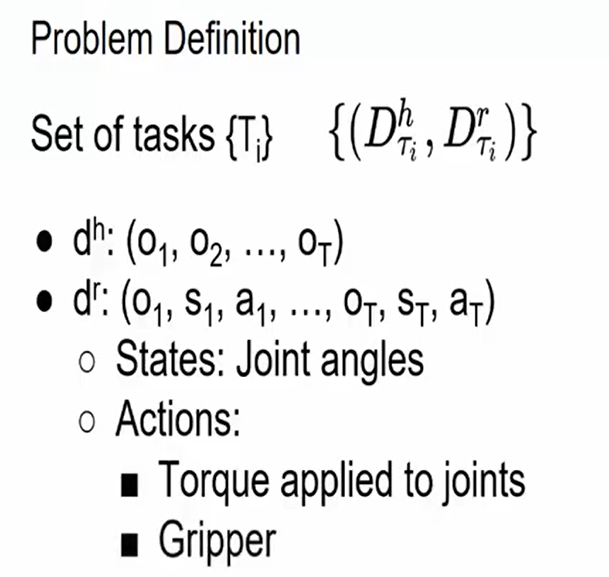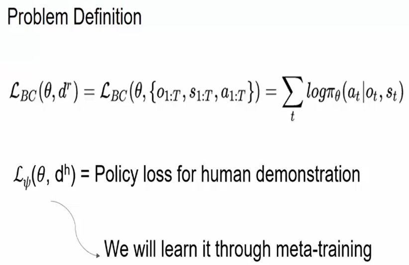 사람 video로부터 배운다는 것은 inference problem이라 볼 수 있는데, 한번의 사람 데모만 보고 prior knowledge를 알아내서 robot policy parameter phi를 그 task에 맞게 추론하는 것.
