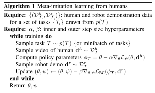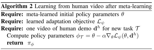 new task에 대해 policy parameter 추론할 때 1개의 human demo와 배운 loss L_psi로부터 theta를 위한 gradient descent를 이용한다.