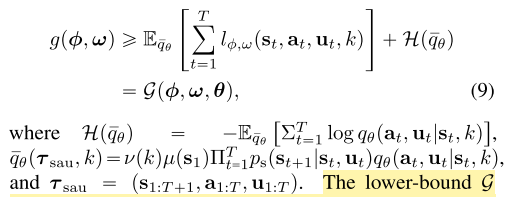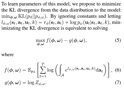 어쨌든 결론은 F-G 를 위와 같이 특정 variational model q_psi와 q_theta를 이용하여 lower-bound를 줄 수 있다는 것이고, 그 lower-bound는 maximum entropy RL과 유사하게 해결할 수 있다는 것이다. 그럼으로써 F-G 최적화를 할 수 있다.